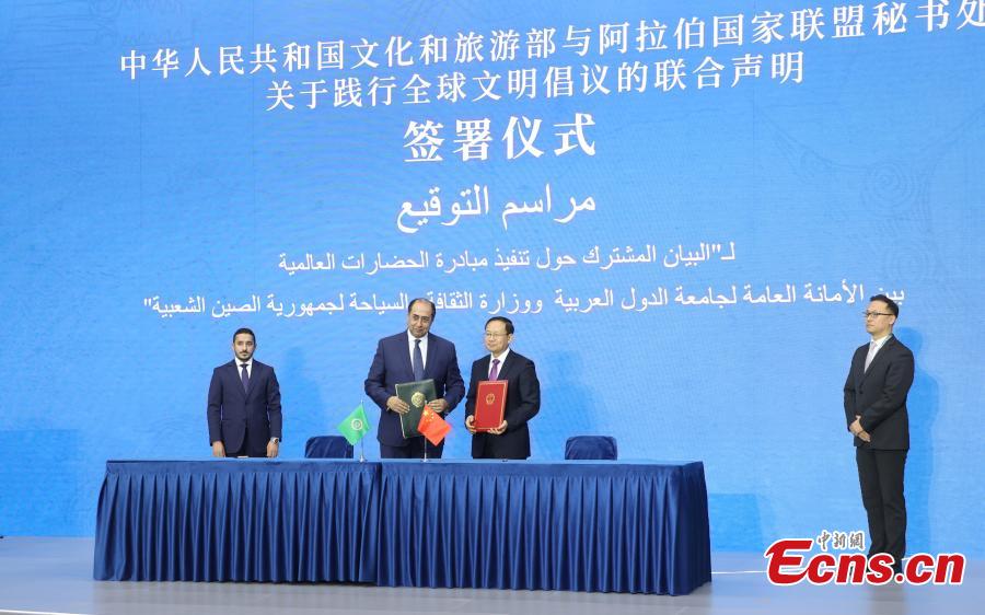 A joint statement aimed at further implementing the Global Civilization Initiative is signed between China and the Arab League during the first Liangzhu Forum in Hangzhou, east China's Zhejiang Province, Dec. 3, 2023. (Photo: China News Service/Wang Gang)