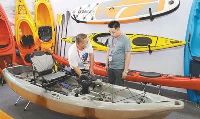 An exhibitor (left) talks with a visitor during the 40th China Sport Show in Xiamen, southeast China's Fujian Province. (Photo/Zeng Demeng)