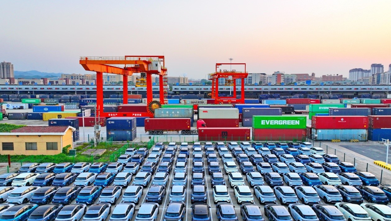 New energy vehicles to be exported are parked in an international land port in Ganzhou, east China's Jiangxi province. (People's Daily Online/Zhu Haipeng)