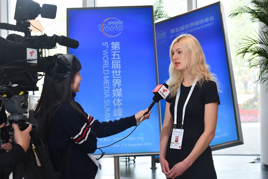 A delegate receives an interview during the opening ceremony of the 5th World Media Summit (WMS) in Guangzhou, capital of south China's Guangdong Province, Dec. 3, 2023. (Xinhua/Mao Siqian)