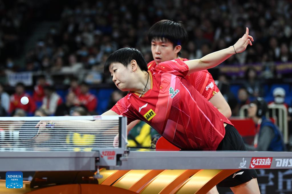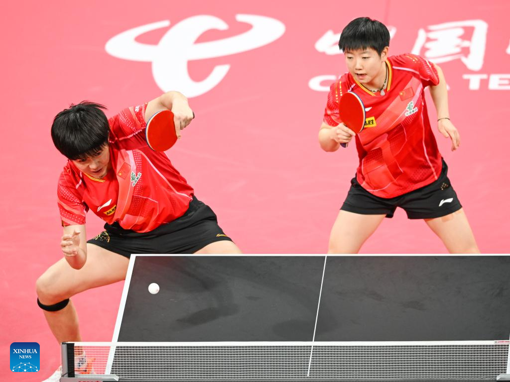 Wang Yidi (R)/Sun Yingsha of China compete during the stage 1 group 1 women's doubles match against Adriana Diaz/Melanie Diaz of Puerto Rico at the ITTF Mixed Team World Cup 2023 in Chengdu, southwest China's Sichuan Province, Dec. 5, 2023. (Xinhua/Xu Bingjie)