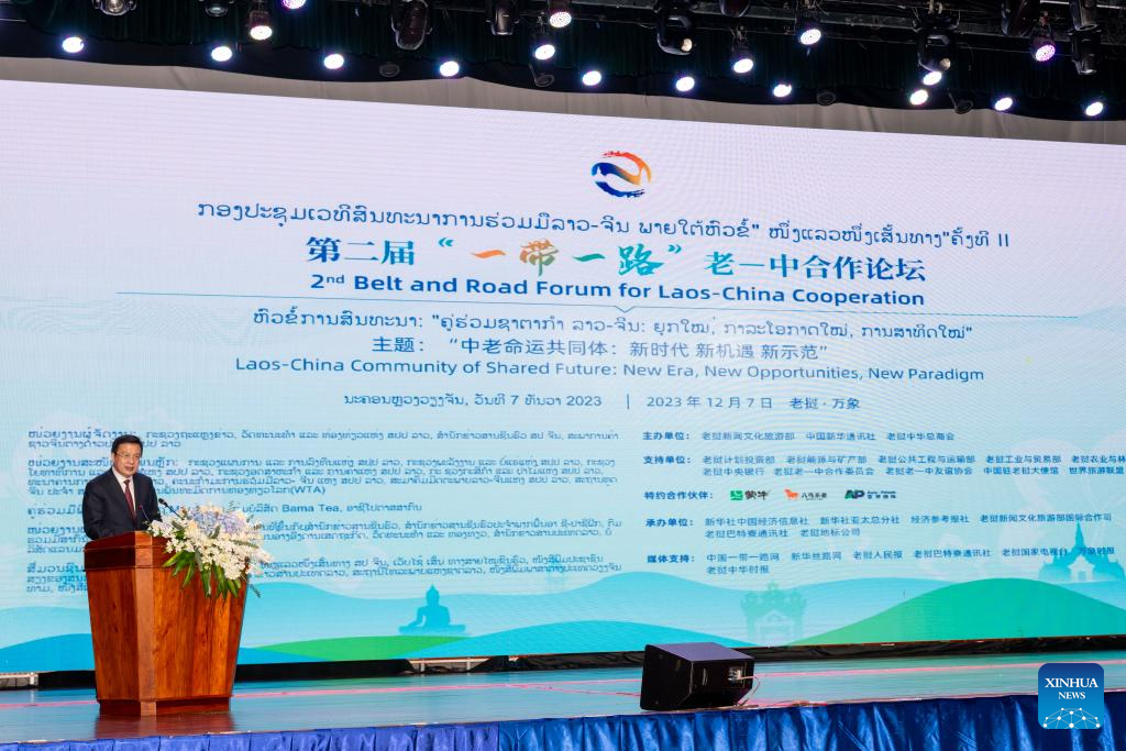 This photo taken on Dec. 7, 2023 shows the second Belt and Road Forum for Laos-China Cooperation held in Vientiane, Laos. The second Belt and Road Forum for Laos-China Cooperation kicked off here Thursday to discuss the implementation of the outcomes of the meeting between the top leaders of the two parties and the two countries, and the building of the China-Laos community with a shared future. Thongloun Sisoulith, general secretary of the Lao People's Revolutionary Party (LPRP) Central Committee and Lao president, sent a congratulatory letter to the forum. (Xinhua/Zhu Wei)