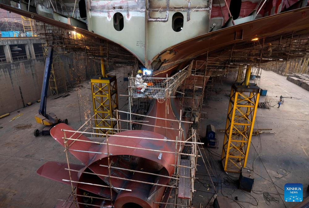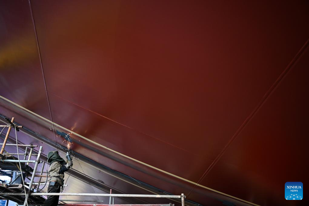 A worker is seen at a shipyard of Jiangsu Yangzi Xinfu Shipbuilding Co., Ltd. in Taixing, east China's Jiangsu Province, Dec. 5, 2023.