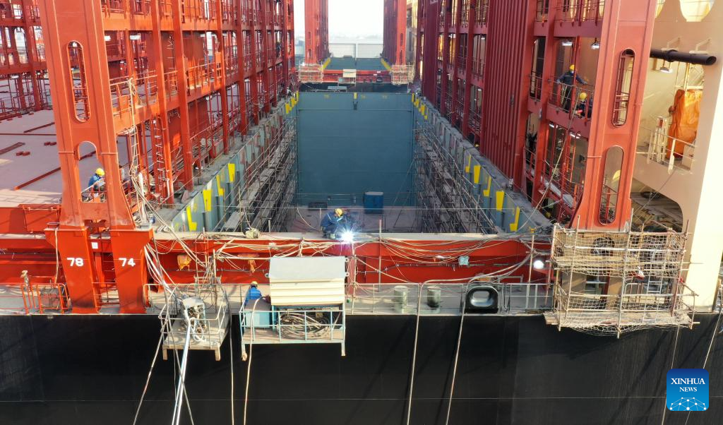 Workers work on a container vessel at a shipyard of Jiangsu Yangzi Xinfu Shipbuilding Co., Ltd. in Taixing, east China's Jiangsu Province, Dec. 5, 2023.
