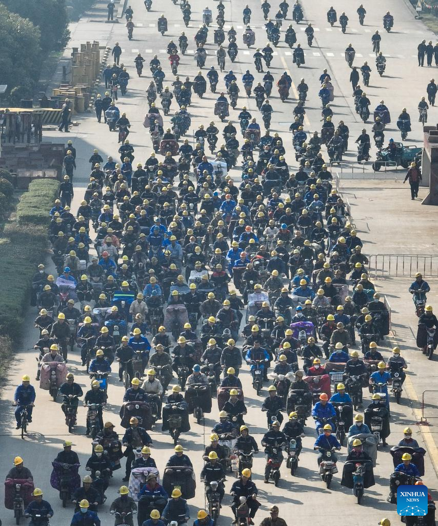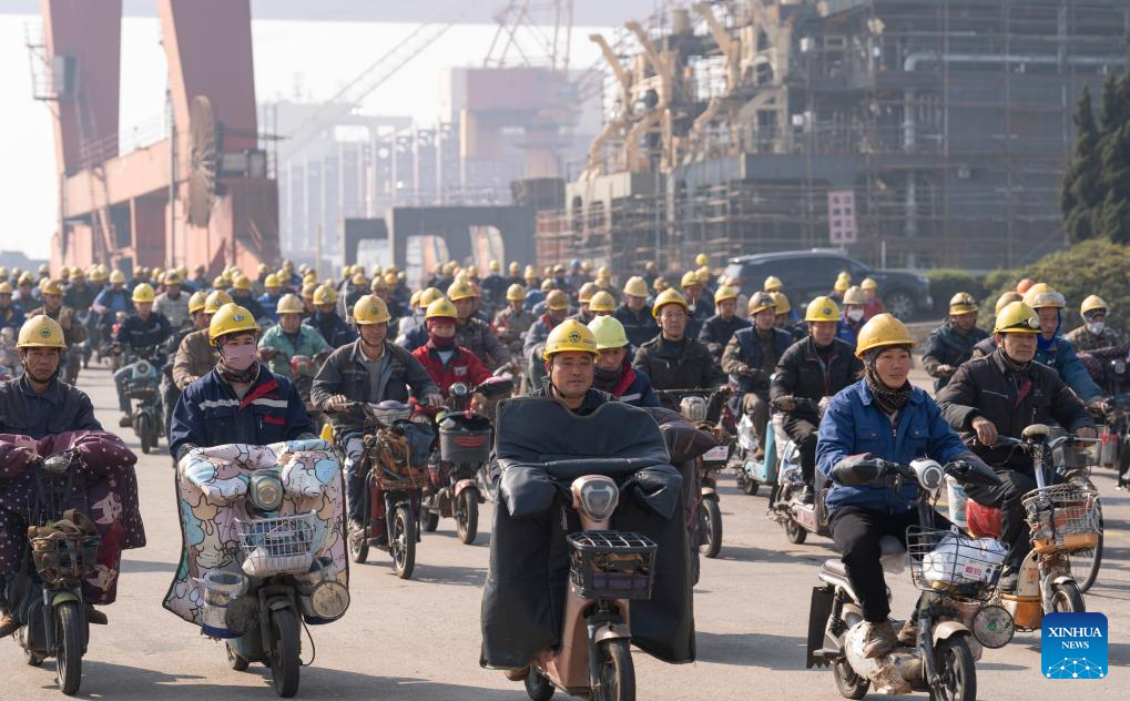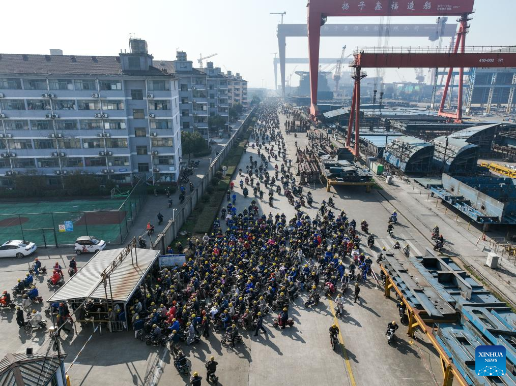 This aerial photo taken on Dec. 5, 2023 shows workers riding to leave a shipyard of Jiangsu Yangzi Xinfu Shipbuilding Co., Ltd. in Taixing, east China's Jiangsu Province.