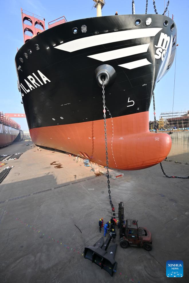 Workers install an anchor to a container vessel at a shipyard of Jiangsu Yangzi Xinfu Shipbuilding Co., Ltd. in Taixing, east China's Jiangsu Province, Dec. 5, 2023.
