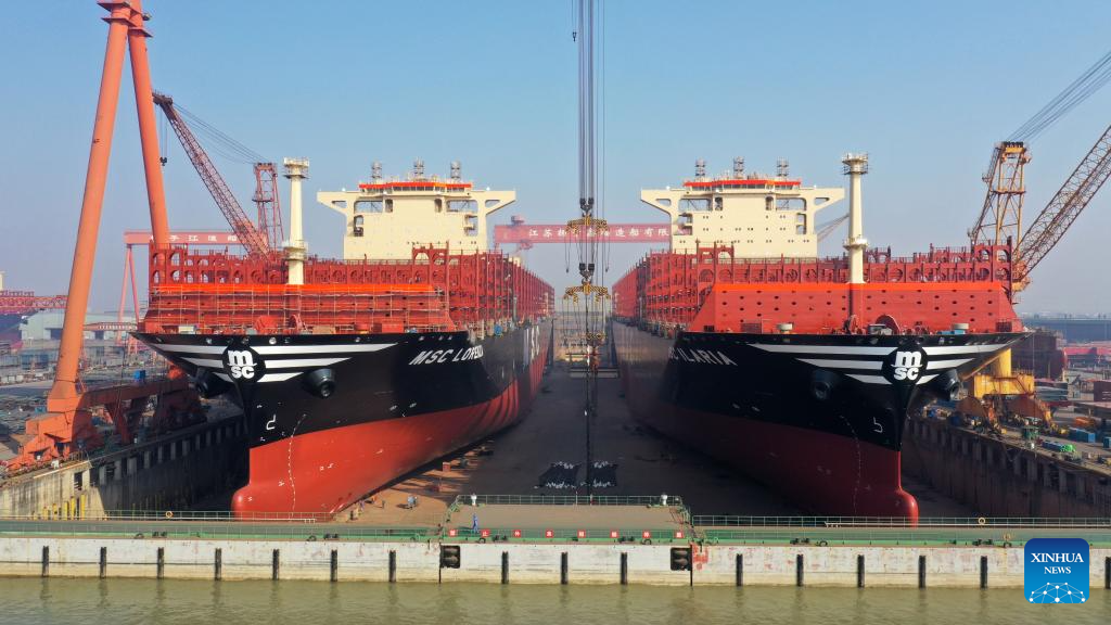 This aerial photo taken on Dec. 5, 2023 shows container vessels at a shipyard of Jiangsu Yangzi Xinfu Shipbuilding Co., Ltd. in Taixing, east China's Jiangsu Province.