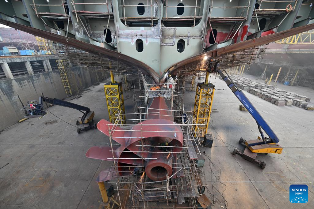 Workers work on components of a container vessel at a shipyard of Jiangsu Yangzi Xinfu Shipbuilding Co., Ltd. in Taixing, east China's Jiangsu Province, Dec. 5, 2023.