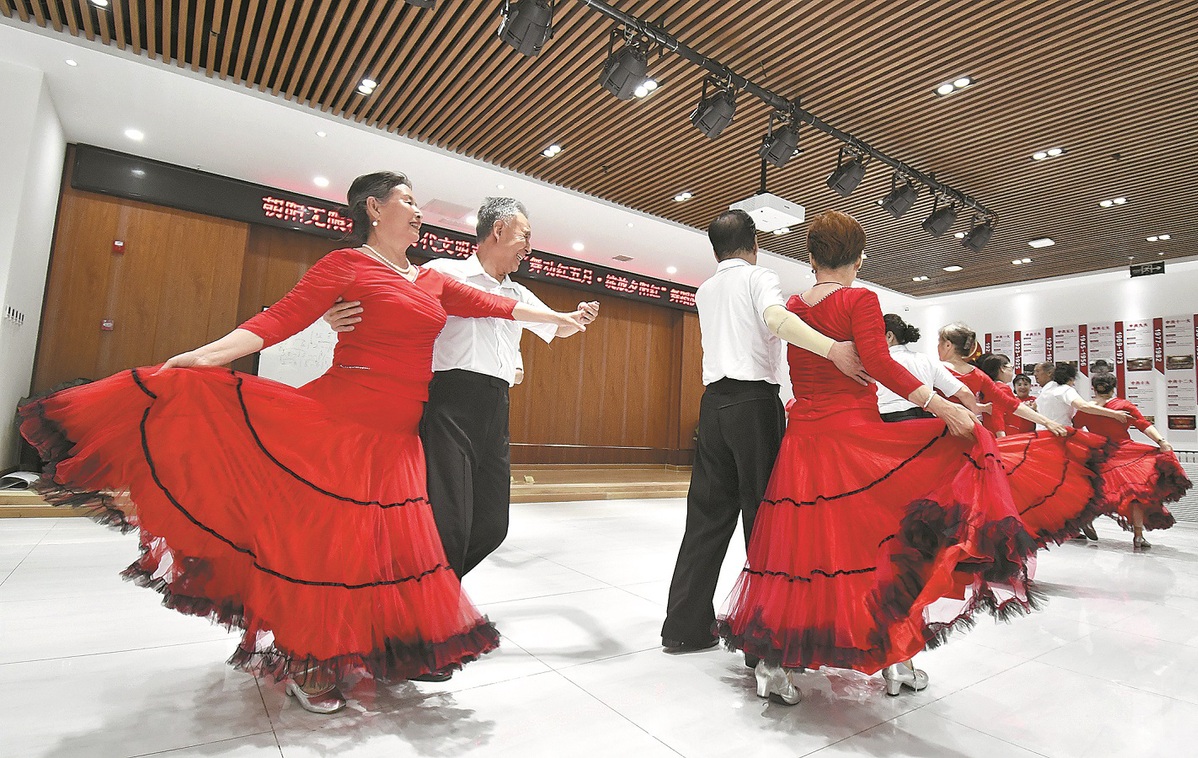 Elderly people rehearse a dance routine at a residential community in Beijing's Chaoyang district in May. Chaoyang's Balizhuang subdistrict organized various canteens and elderly care centers among its communities to enrich elderly residents' lives. LI XIN/XINHUA