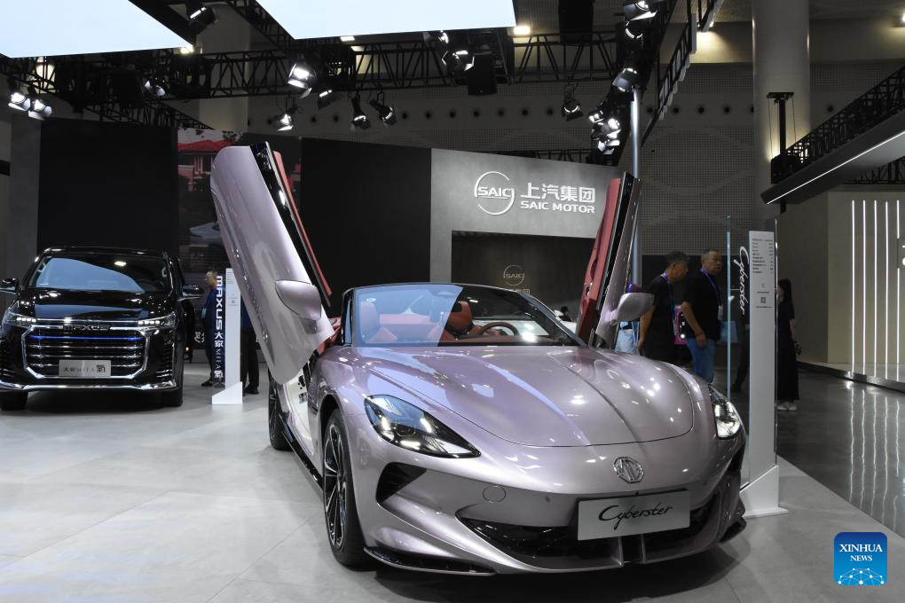 This photo shows a MG Cyberster vehicle of China's car manufacturer SAIC displayed at the 2023 World New Energy Vehicle Congress in Haikou, south China's Hainan Province, Dec. 7, 2023. (Xinhua/Xia Tian)