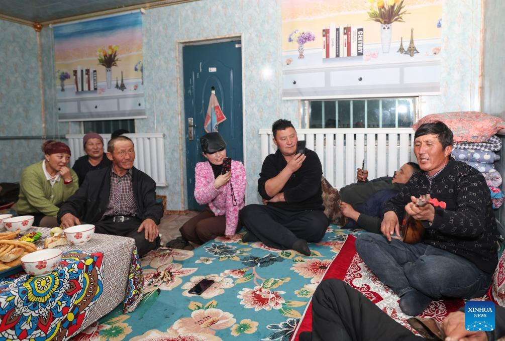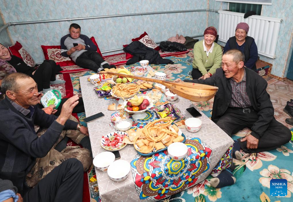 Relatives of Baht chat and sing during a gathering in Yumin County, northwest China's Xinjiang Uygur Autonomous Region, Nov. 30, 2023. (Xinhua/Hu Huhu)