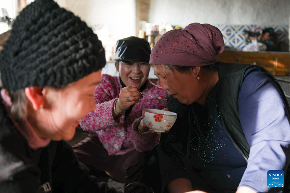 Baht (L) prepares to serve guests noodles with her eldest daughter and sister-in-law (C) in Yumin County, northwest China's Xinjiang Uygur Autonomous Region, Nov. 30, 2023. (Xinhua/Hu Huhu)