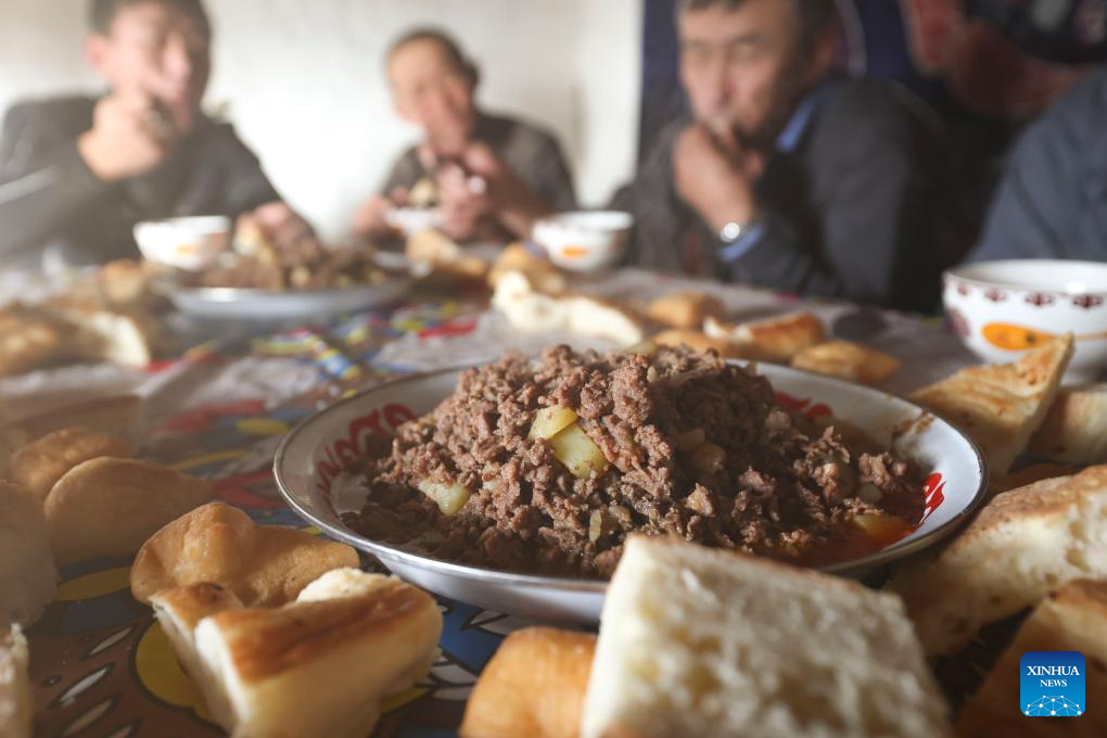 A dish of potatoes and beef is pictured during a meal at Baht's home in Yumin County, northwest China's Xinjiang Uygur Autonomous Region, Dec. 1, 2023. (Xinhua/Hu Huhu)