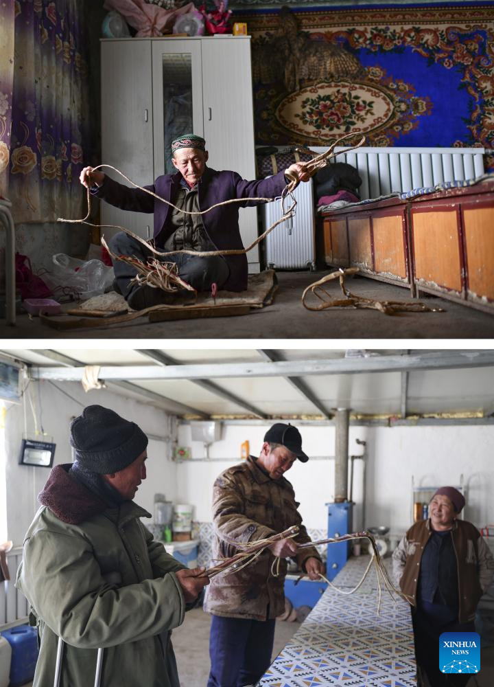 This combo photo shows Habudelashen Nusupbek making grazing tools for sale at home on Feb. 11, 2023 (above) and herders asking the price of the grazing tools at Baht's shop on Nov. 30, 2023 (bottom) in Yumin County, northwest China's Xinjiang Uygur Autonomous Region. (Xinhua/Hu Huhu)