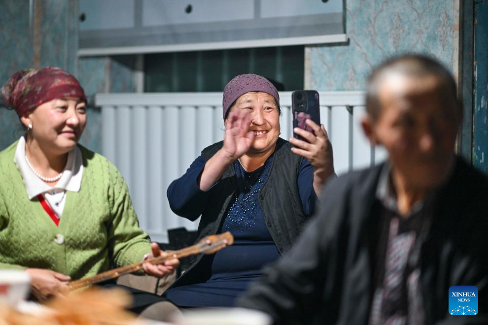 Baht (C) chats with her youngest daughter via video call during a gathering in Yumin County, northwest China's Xinjiang Uygur Autonomous Region, Nov. 30, 2023. (Xinhua/Hu Huhu)