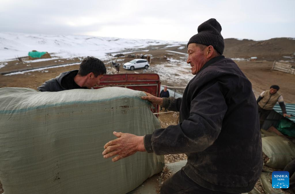 Habudelashen Nusupbek (R) and other families unload forage transported by his son-in-law in Yumin County, northwest China's Xinjiang Uygur Autonomous Region, Dec. 1, 2023. (Xinhua/Hu Huhu)
