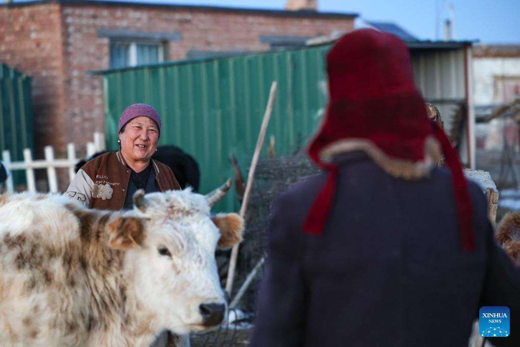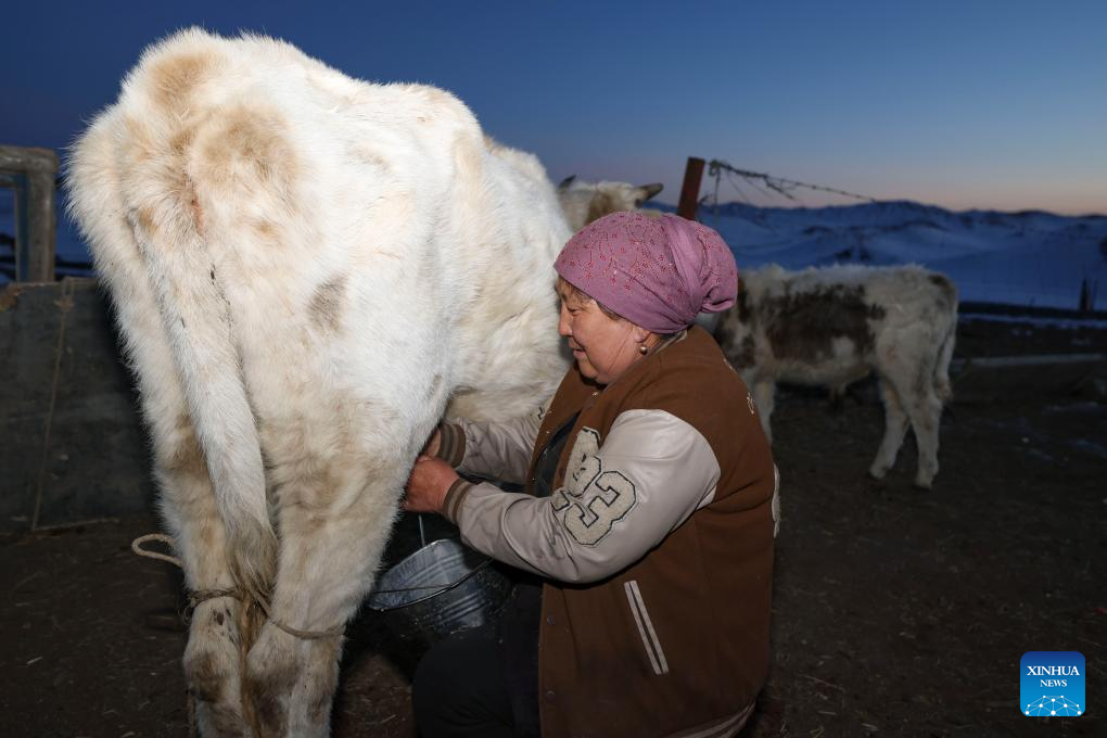 Baht milks a cow to make milk tea for guests at the yard of her home in Yumin County, northwest China's Xinjiang Uygur Autonomous Region, Nov. 29, 2023. (Xinhua/Hu Huhu)