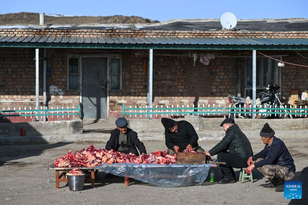 Habudelashen Nusupbek cuts beef at the yard of his home in Yumin County, northwest China's Xinjiang Uygur Autonomous Region, Nov. 30, 2023. (Xinhua/Hu Huhu)