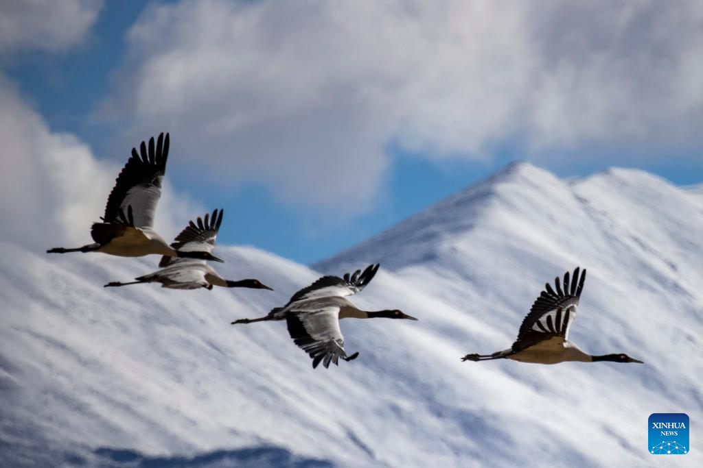 This photo taken on Dec. 8, 2023 shows black-necked cranes flying past snow-covered mountains in Lhasa, southwest China's Xizang Autonomous Region. (Xinhua/Jiang Fan)