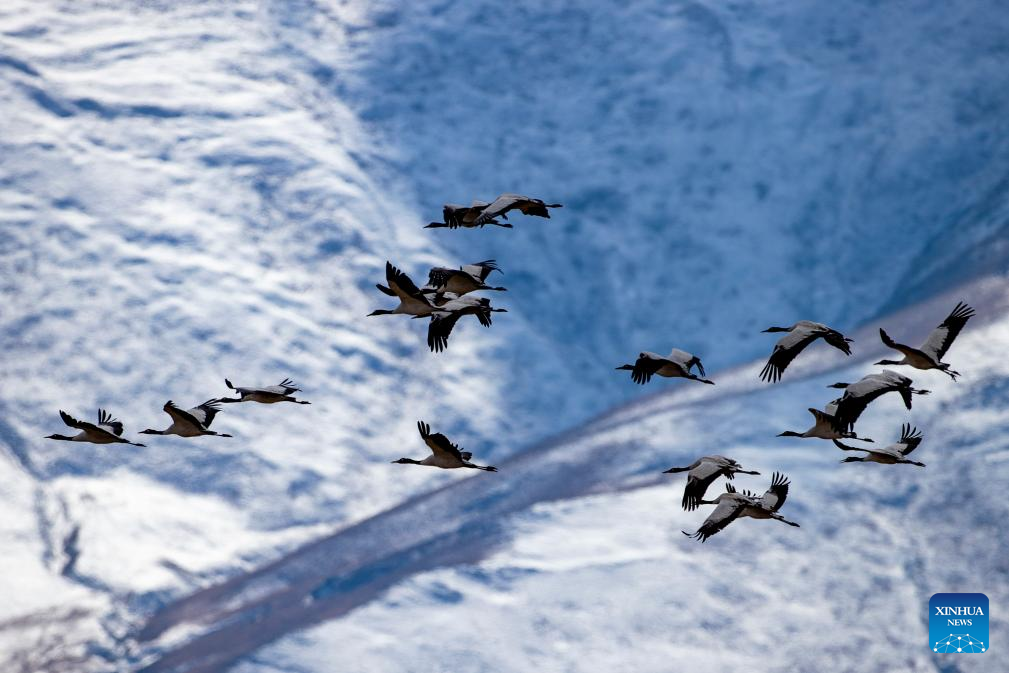 This photo taken on Dec. 8, 2023 shows black-necked cranes flying past snow-covered mountains in Lhasa, southwest China's Xizang Autonomous Region. (Xinhua/Jigme Dorje)