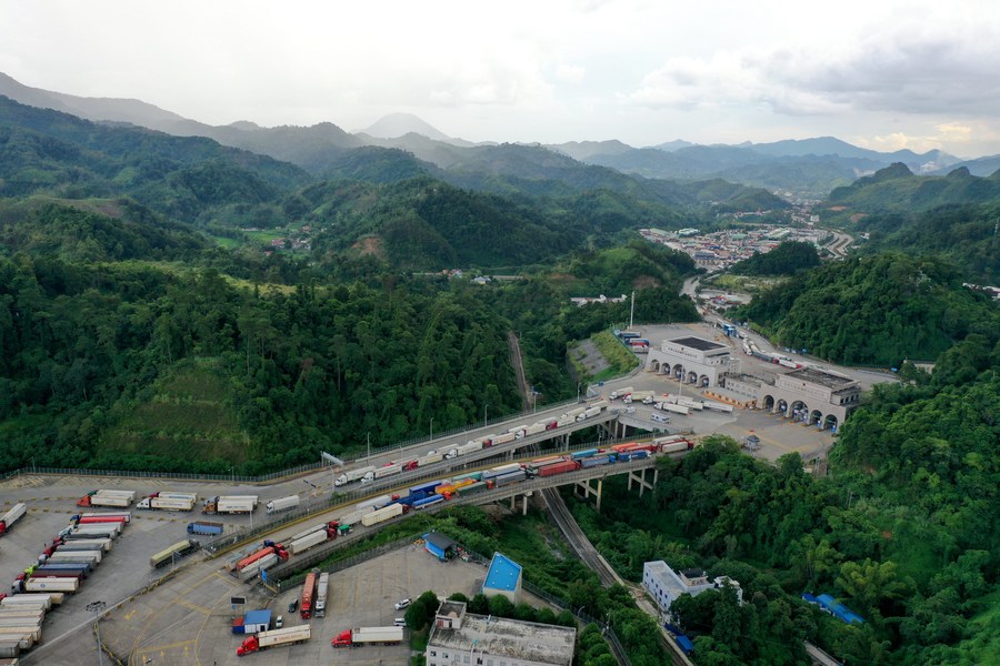 This aerial photo taken on Sept. 9, 2023 shows a view of the port of the Friendship Pass in Pingxiang, south China's Guangxi Zhuang Autonomous Region. (Xinhua/Cao Yiming)