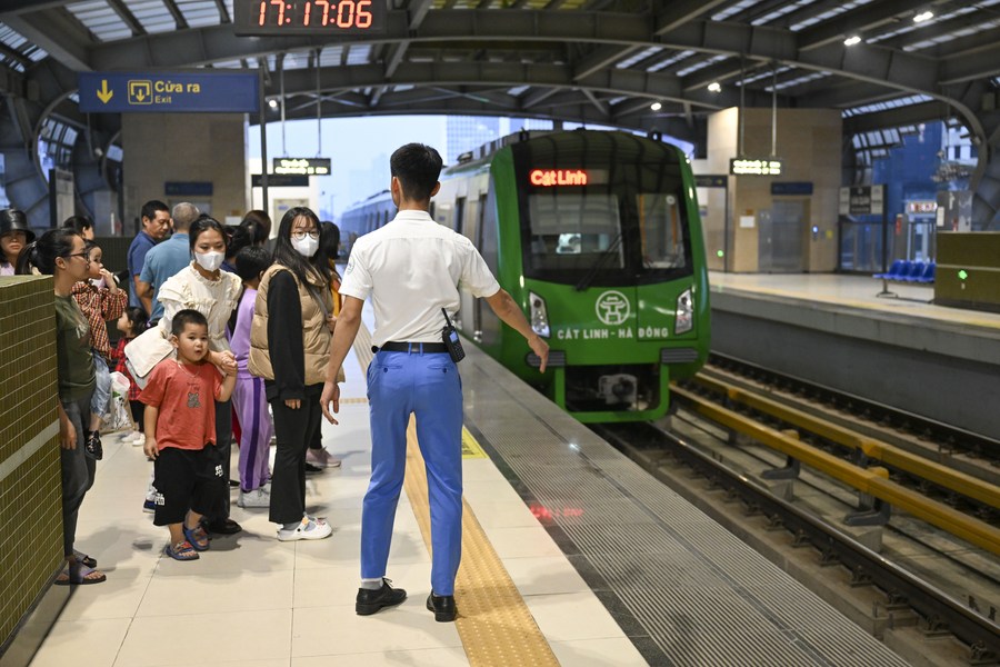 People wait for a train of the Cat Linh-Ha Dong urban elevated railway in Hanoi, Vietnam, Dec. 9, 2023. (Xinhua/Cheng Yiheng)