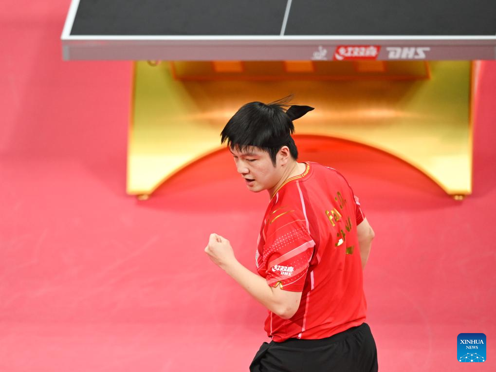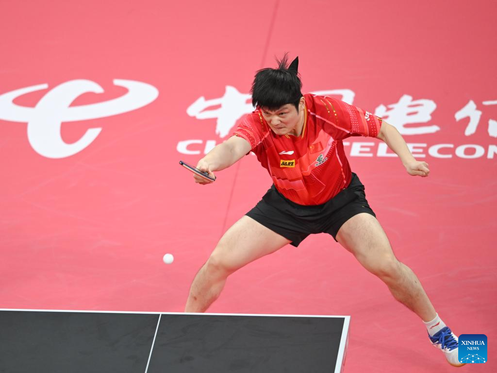 Fan Zhendong of China competes during the stage 2 men's singles match against Lee Sangsu of South Korea at the ITTF Mixed Team World Cup 2023 in Chengdu, southwest China's Sichuan Province, Dec. 10, 2023. (Xinhua/Wang Xi)
