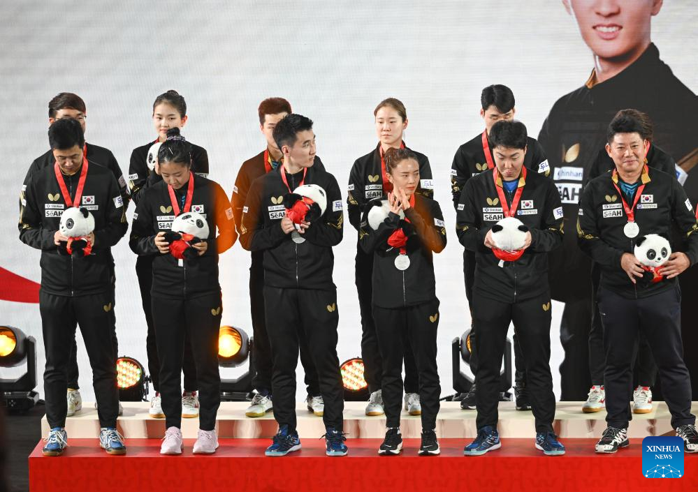 Second placed team South Korea attend the awarding ceremony of the ITTF Mixed Team World Cup 2023 in Chengdu, southwest China's Sichuan Province, Dec. 10, 2023. (Xinhua/Wang Xi)