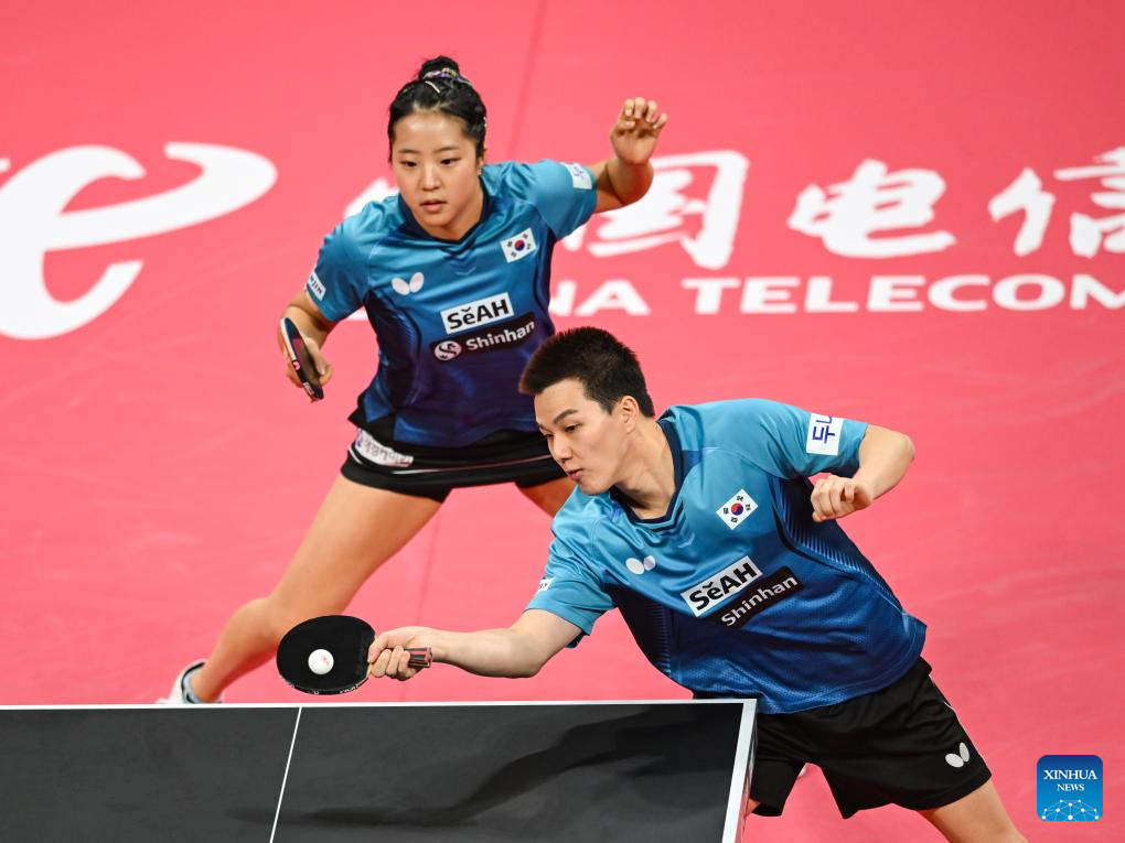 Shin Yubin/An Jaehyun (R) of South Korea compete during the stage 2 mixed doubles match against Wang Chuqin/Sun Yingsha of China at the ITTF Mixed Team World Cup 2023 in Chengdu, southwest China's Sichuan Province, Dec. 10, 2023. (Xinhua/Wang Xi)