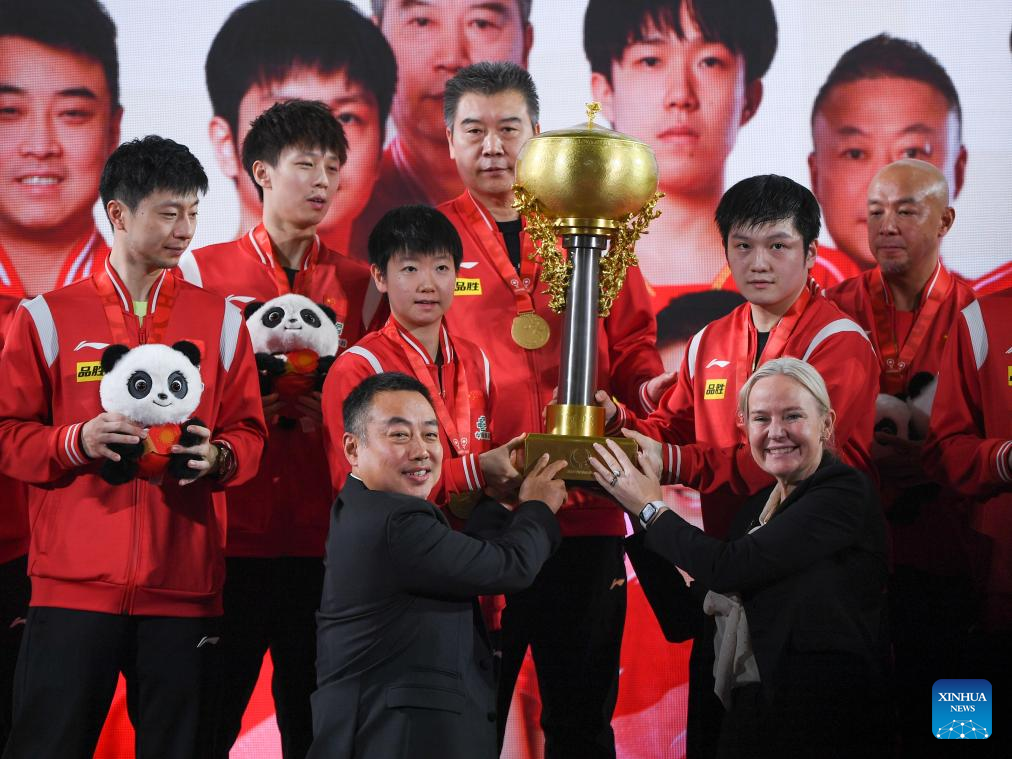 First placed team China celebrate during the awarding ceremony of the ITTF Mixed Team World Cup 2023 in Chengdu, southwest China's Sichuan Province, Dec. 10, 2023. (Xinhua/Wang Xi)