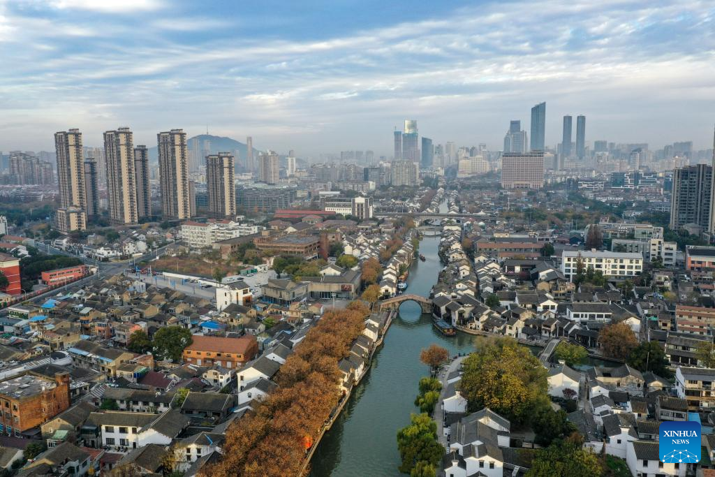 This aerial photo taken on Dec. 9, 2023 shows the view of a historical and cultural district along the Grand Canal in Wuxi, east China's Jiangsu Province. (Xinhua/Yang Lei)