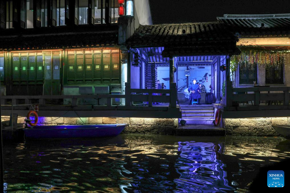 Artists perform Pingtan, a form of ballad singing in local dialect with Chinese instruments, at a historical and cultural district along the Grand Canal in Wuxi, east China's Jiangsu Province, Dec. 7, 2023. (Xinhua/Yang Lei)