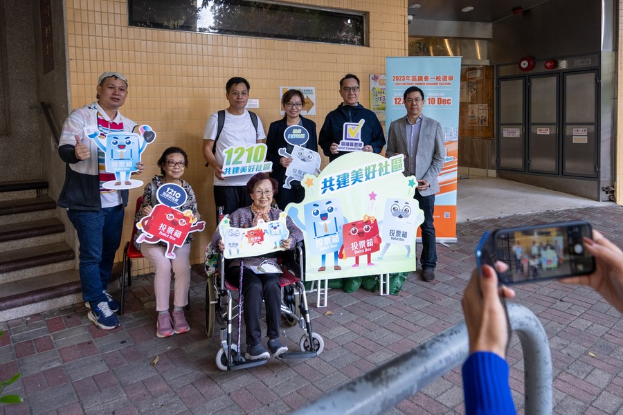 Hong Kong residents pose for pictures outside a polling station after casting their votes for the 7th District Council Ordinary Election of the Hong Kong Special Administrative Region (HKSAR) in Hong Kong, China, Dec 10, 2023. [Photo/Xinhua]