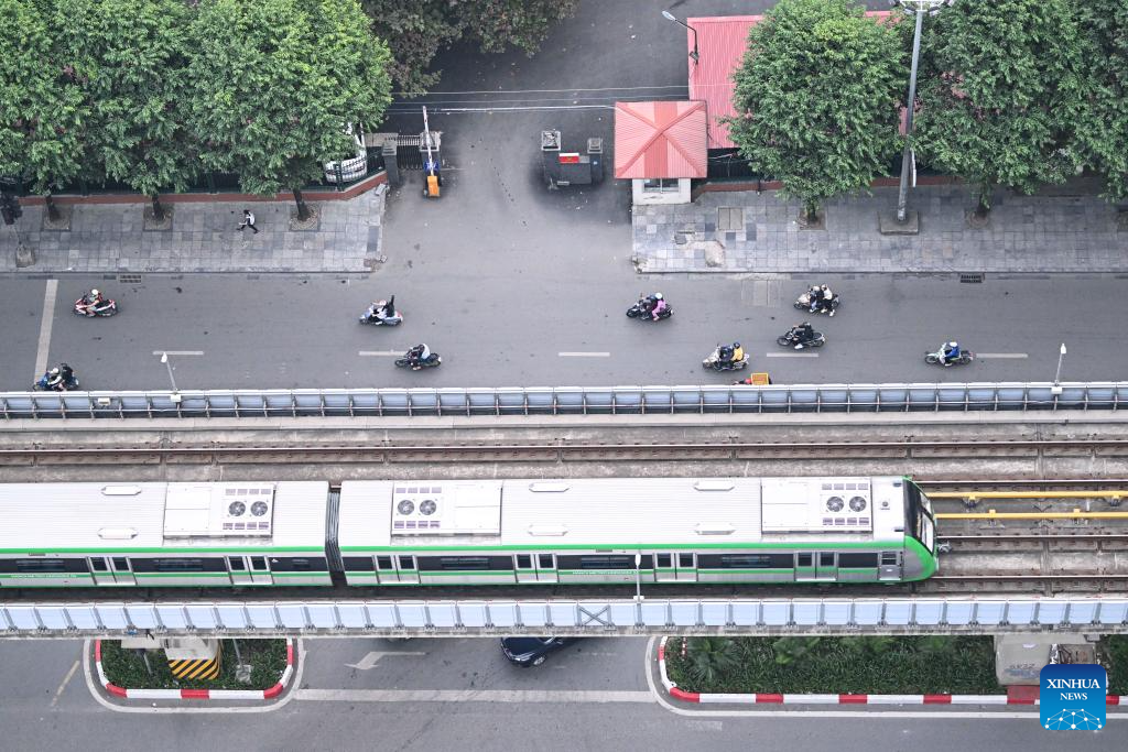 A train runs on the Cat Linh-Ha Dong urban elevated railway in Hanoi, capital of Vietnam, Dec. 9, 2023.?(Xinhua/Cheng Yiheng)