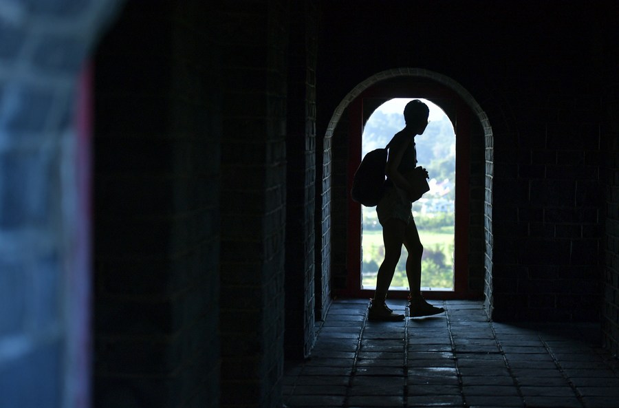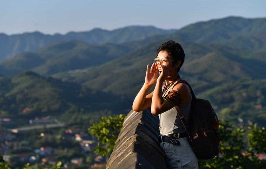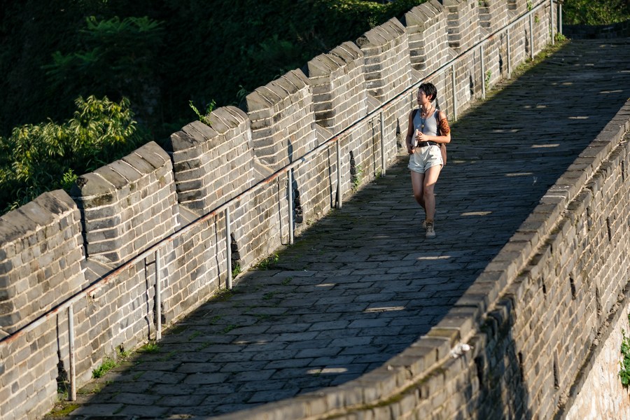 Jiang Yige visits the Hushan section of the Great Wall in Dandong City, northeast China's Liaoning Province, Aug. 23, 2023. (Xinhua/Yang Qing)