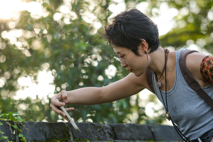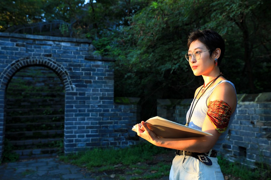 Jiang Yige creates a drawing at the Hushan section of the Great Wall in Dandong City, northeast China's Liaoning Province, Aug. 23, 2023. (Xinhua/Zhang Xinjing)