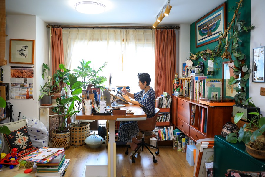 Jiang Yige sorts out drawings at home in Dandong City, northeast China's Liaoning Province, Aug. 22, 2023. (Xinhua/Yang Qing)