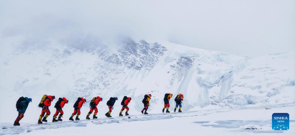 Chinese climbers scale Mount Qomolangma in southwest China's Xizang Autonomous Region, May 23, 2023. A meeting for Mount Qomolangma guides was held in Lhasa on Monday. Experienced mountaineers shared their skills and stories to over 500 mountain guides, mountaineering enthusiasts and outdoor sports practitioners. (Mountain guide team of Sichuan-Tibet Expedition Co., Ltd/Handout via Xinhua)