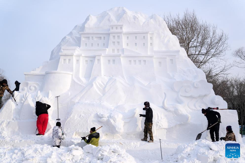 Sculptors work on a giant snow sculpture at the Sun Island scenic area in Harbin, northeast China's Heilongjiang Province, Dec. 12, 2023. With numerous snow sculptures constructed in the theme park titled "snow world", the city of Harbin, known as China's "ice city" in the northeast, is witnessing the coming of its high season for tourism. (Xinhua/Zhang Tao)