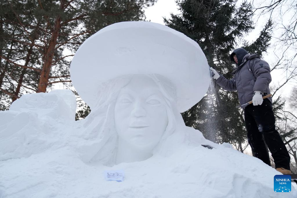 A sculptor works on a snow sculpture at the Sun Island scenic area in Harbin, northeast China's Heilongjiang Province, Dec. 12, 2023. With numerous snow sculptures constructed in the theme park titled "snow world", the city of Harbin, known as China's "ice city" in the northeast, is witnessing the coming of its high season for tourism. (Xinhua/Zhang Tao)
