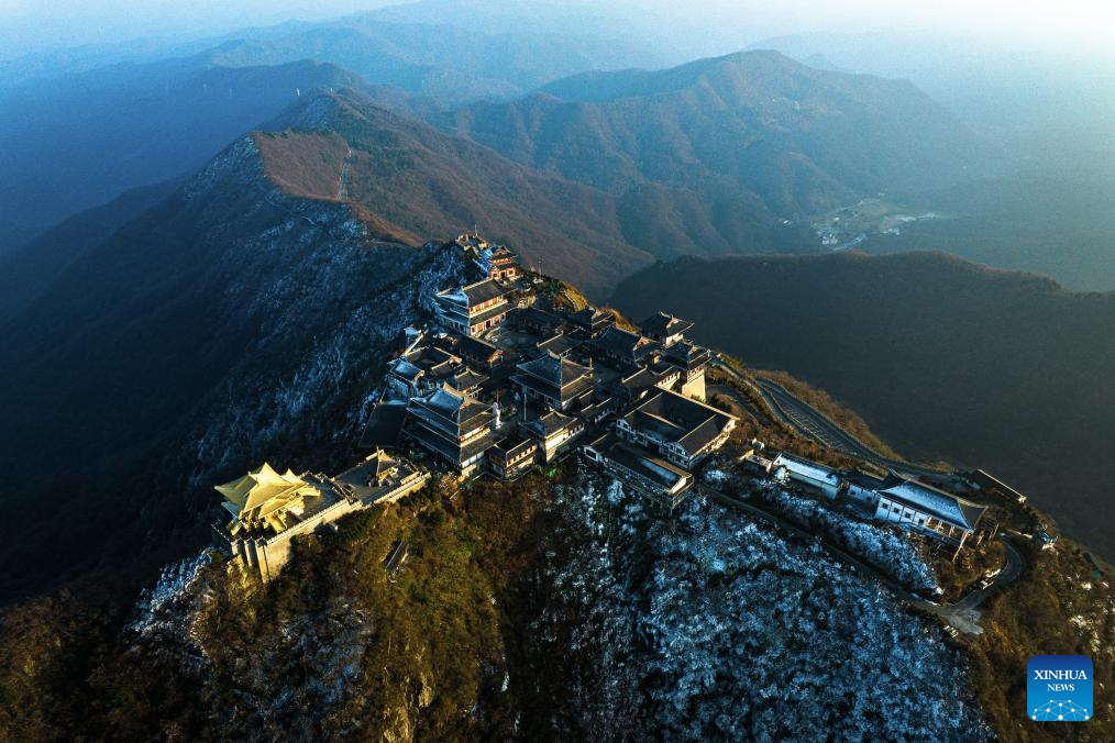 This aerial photo taken on Dec. 12, 2023 shows Dahong Mountain Scenic Spot in Suizhou City, central China's Hubei Province. (Xinhua/Xiao Yijiu)