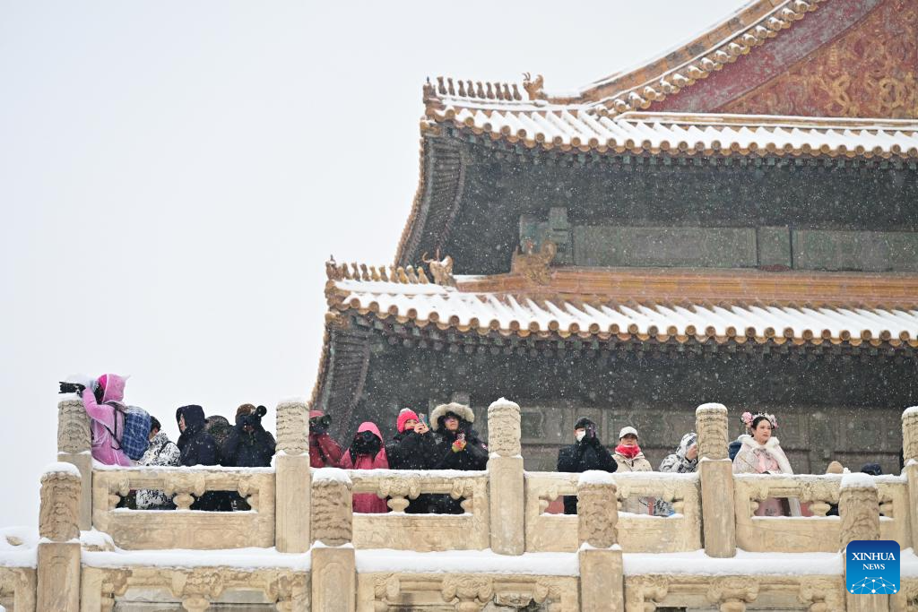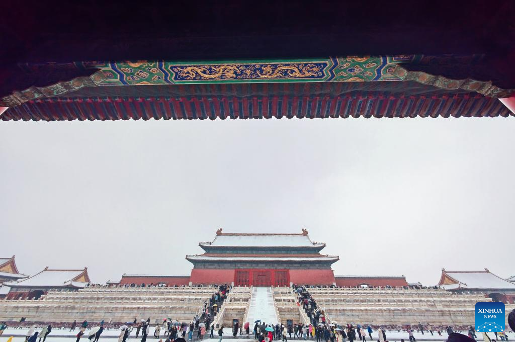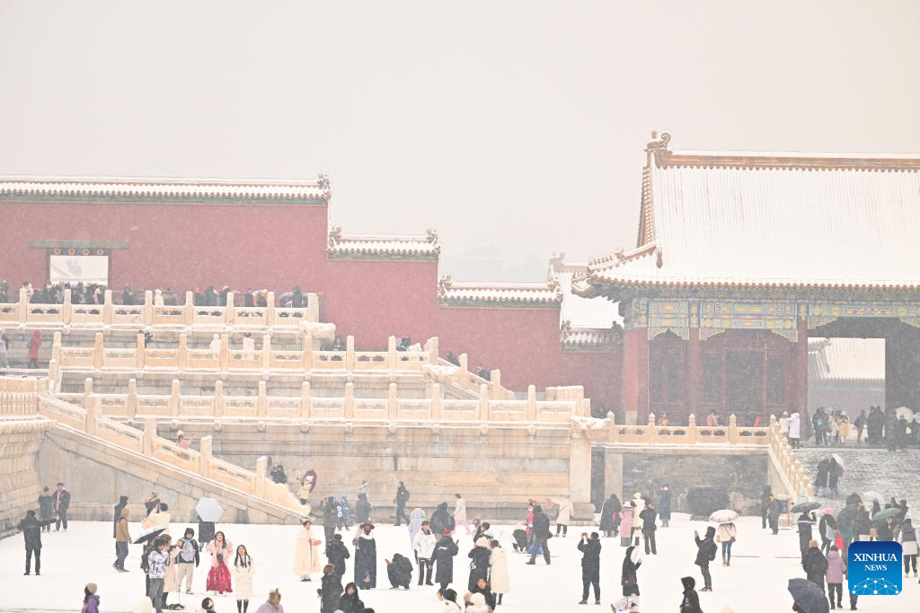 Tourists visit the Palace Museum in snow in Beijing, capital of China, Dec. 13, 2023. China's meteorological authority on Wednesday renewed a yellow alert for blizzards, forecasting intense snowfall in the north of the country. (Xinhua/Li Xin)