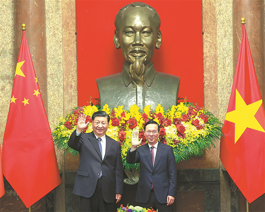 In talks with Vietnamese President Vo Van Thuong in Hanoi, Xi, who is also general secretary of the Communist Party of China Central Committee, said the two sides should focus on six major goals — higher political mutual trust, more practical security cooperation, deeper pragmatic cooperation, a stronger foundation of public opinion, closer multilateral coordination, and better management of differences — to translate the vision into concrete outcomes.