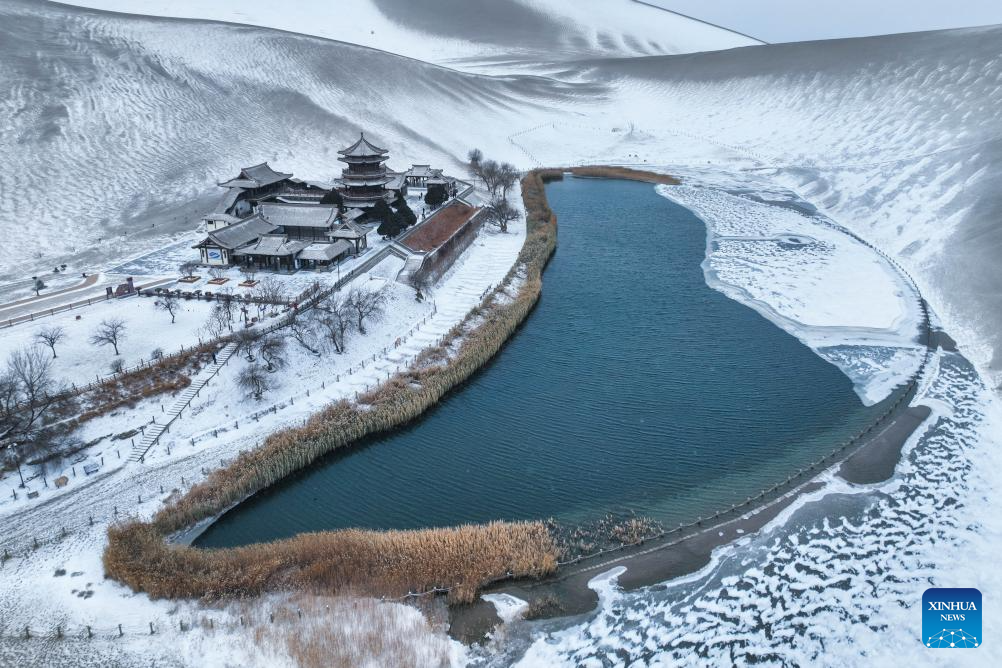 This aerial photo taken on Dec. 14, 2023 shows the winter scenery at the Mingsha Mountain and Crescent Spring scenic spot in Dunhuang, northwest China's Gansu Province. (Xinhua/Lang Bingbing)