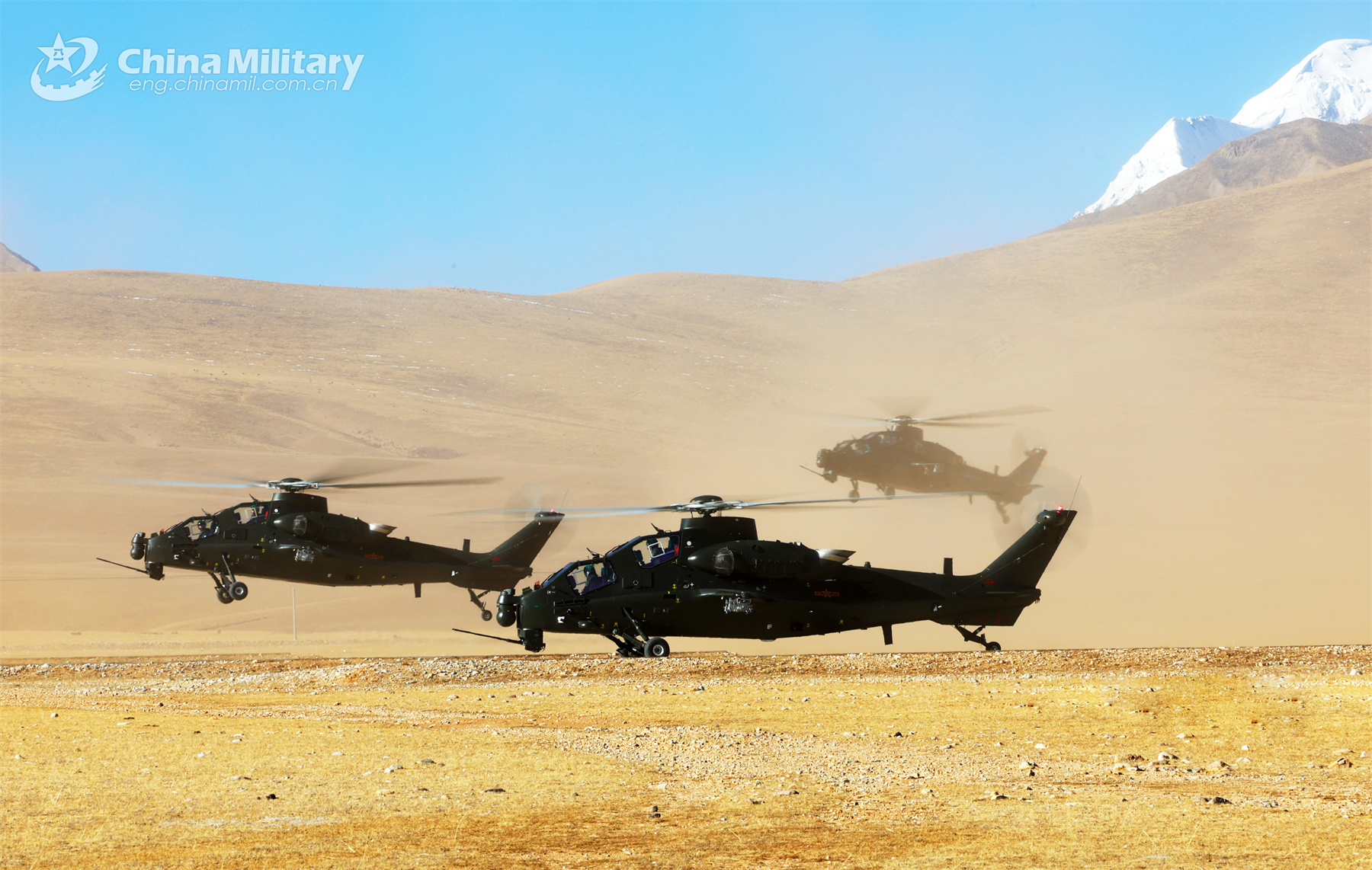Multiple types of helicopters attached to an army aviation brigade under the PLA Xizang Military Command engage in flight training drills on tactical formation flight, field lift-off and landing, distant transportation and others in early December, 2023. (eng.chinamil.com.cn/Photo by Hu Qiwu)