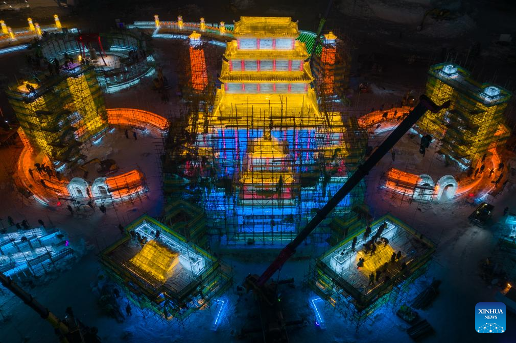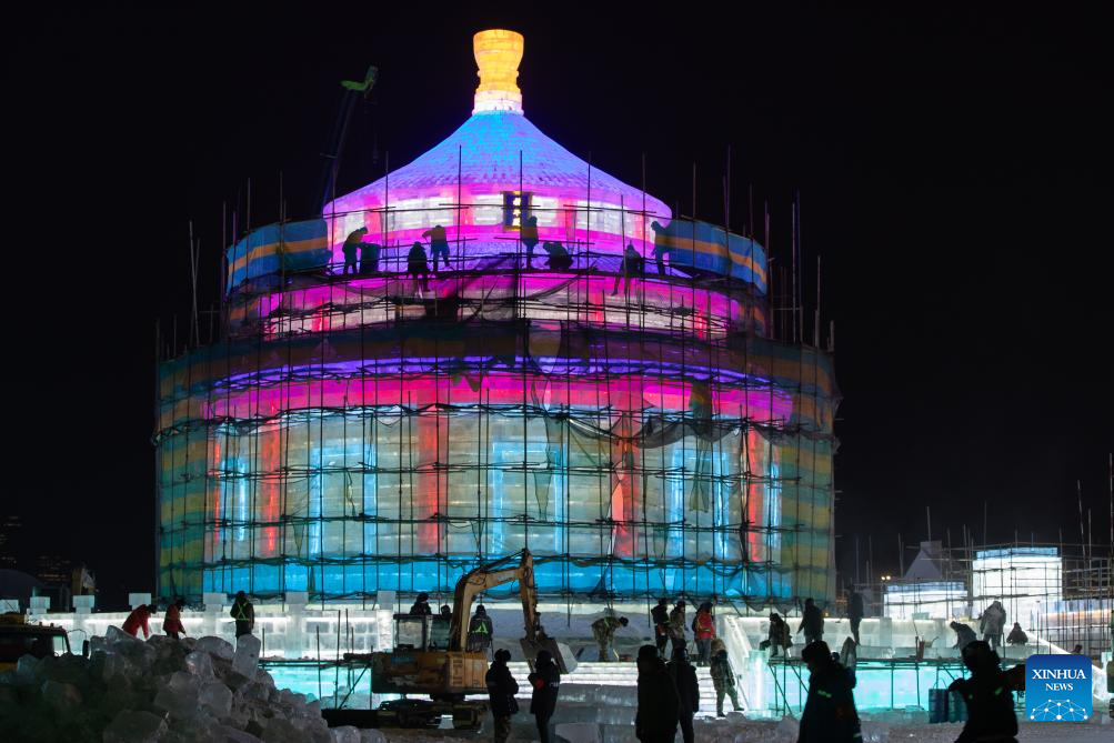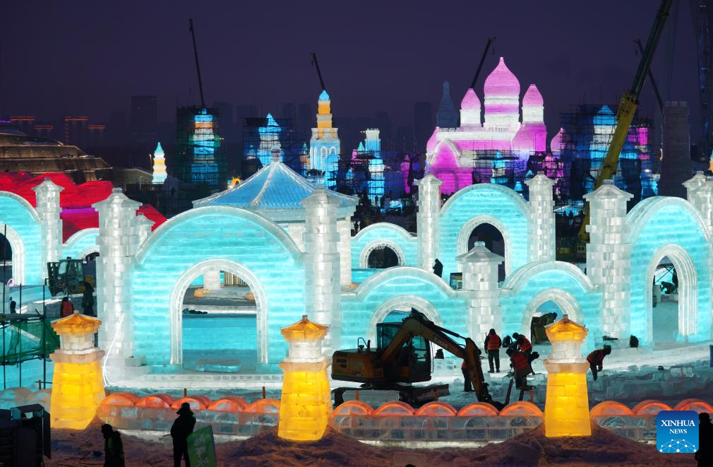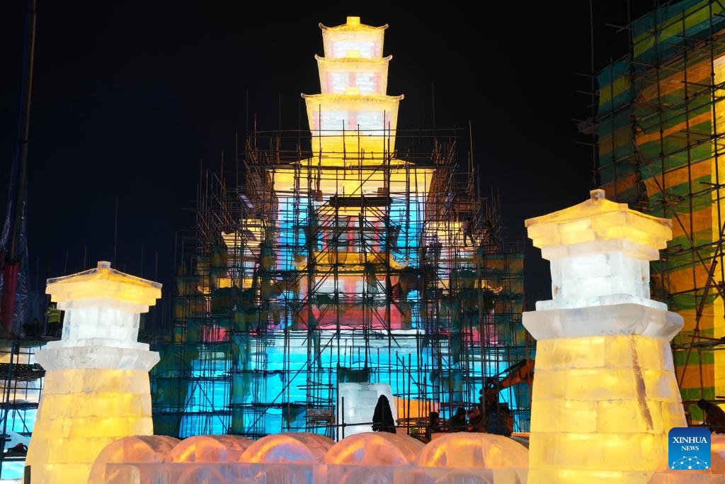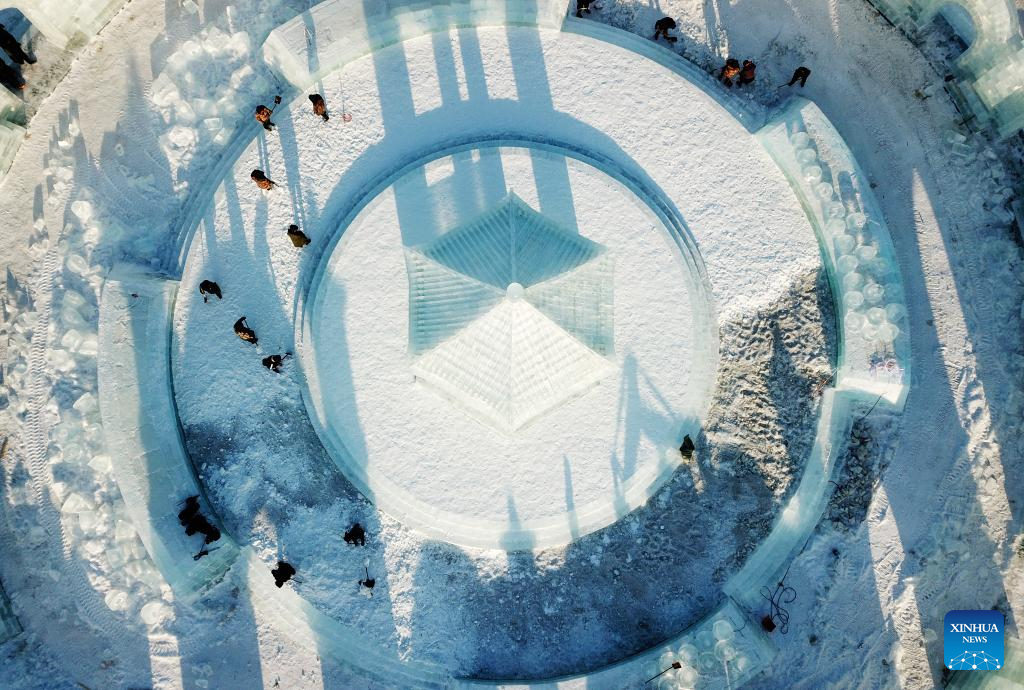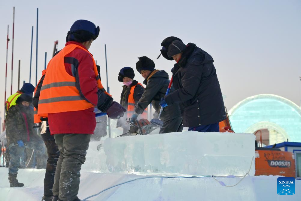 Workers are seen at the construction site of the Harbin Ice and Snow World, a renowned seasonal theme park opening every winter, in Harbin, northeast China's Heilongjiang Province, Dec. 12, 2023. Harbin Ice and snow World will open for its 25th winter season on Dec. 18. It is estimated that 250,000 cubic meters of ice and snow will be used in its construction. (Xinhua/Zhang Tao)