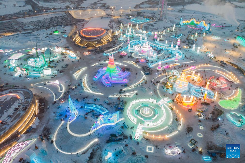 This aerial photo taken on Dec. 14, 2023 shows the construction site of the Harbin Ice and Snow World, a renowned seasonal theme park opening every winter, in Harbin, northeast China's Heilongjiang Province. Harbin Ice and snow World will open for its 25th winter season on Dec. 18. It is estimated that 250,000 cubic meters of ice and snow will be used in its construction. (Xinhua/Xie Jianfei)