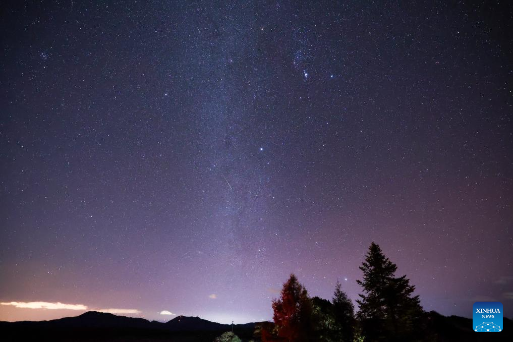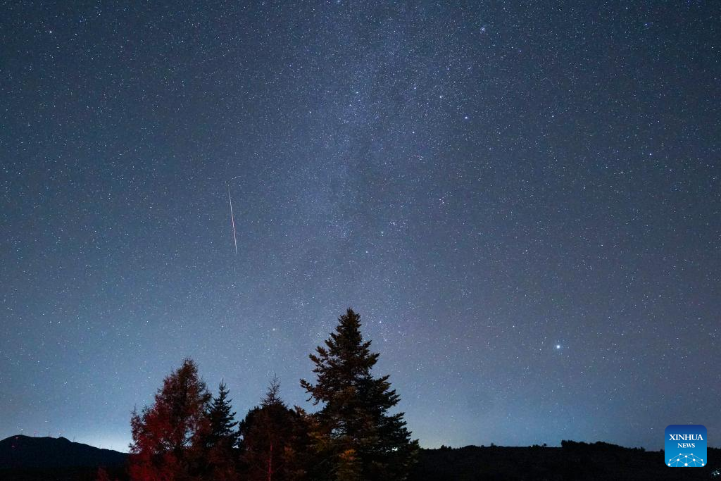 This photo taken on Dec. 15, 2023 shows Geminids meteor shower over Yulong County, Lijiang City, southwest China's Yunnan Province. (Xinhua/Cui Wen)