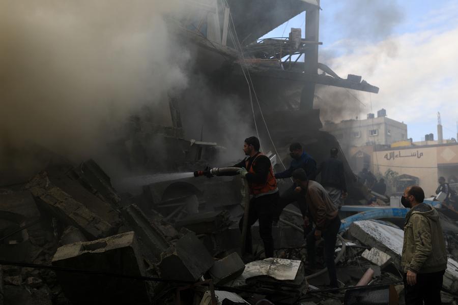 People conduct rescue work amid the rubble of buildings after an Israeli airstrike in the southern Gaza Strip city of Rafah, on Dec. 14, 2023. (Photo by Yasser Qudih/Xinhua)