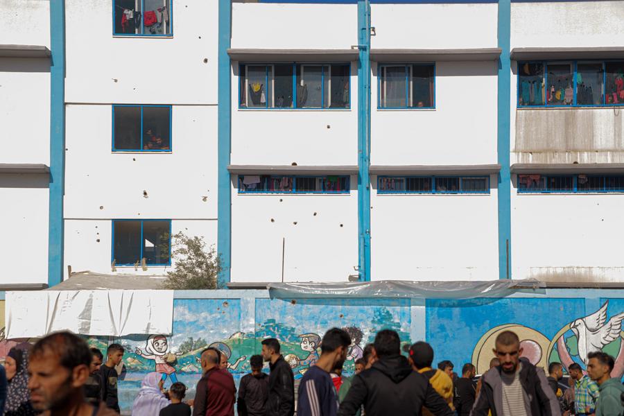 This photo taken on Dec. 3, 2023 shows damage on a school wall after Israeli strikes in the southern Gaza Strip city of Khan Younis. (Photo by Rizek Abdeljawad/Xinhua)